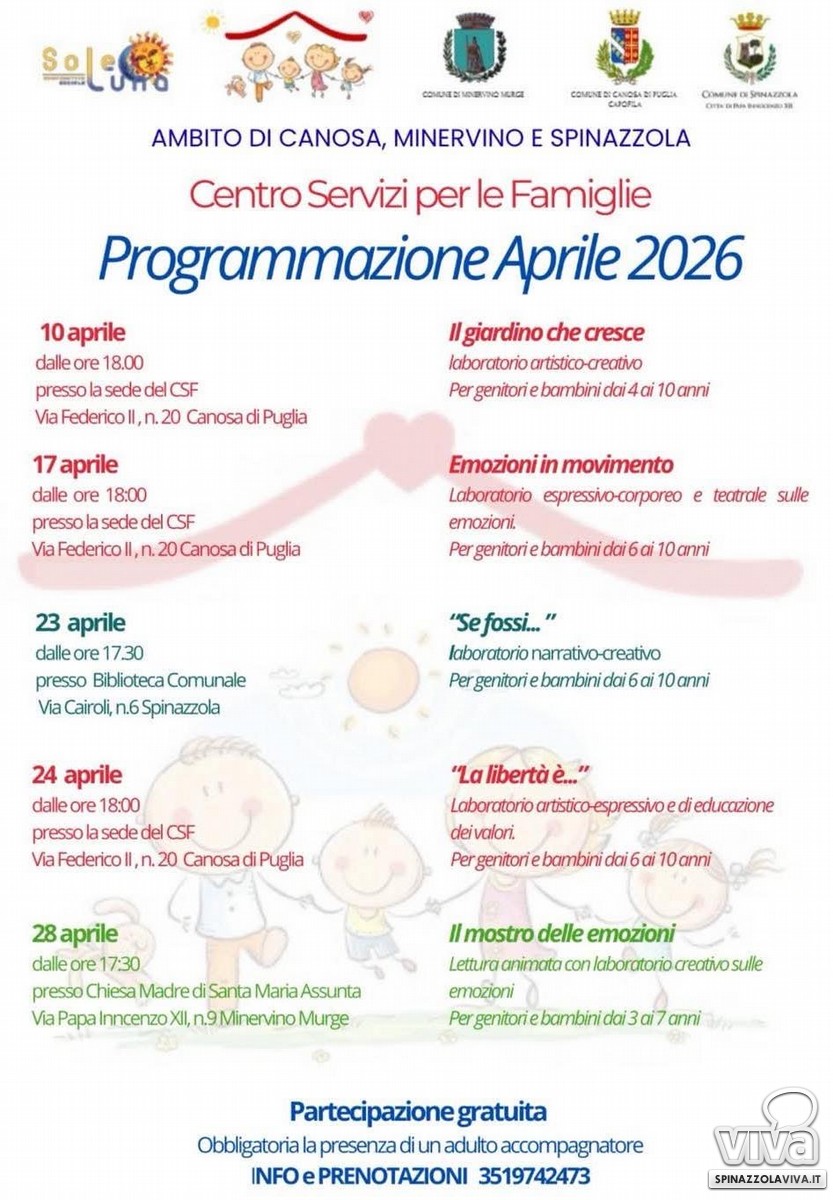 Stimolare creatività, momenti di gioco e di riflessione. Questi gli obiettivi della rassegna di eventi gratuiti, dedicati ai bambini dai 4 ai 10 anni, nell'ambito della programmazione di aprile 2026 organizzata dal Centro Servizi per le famiglie dell'ambito di Canosa, Minervino e Spinazzola.