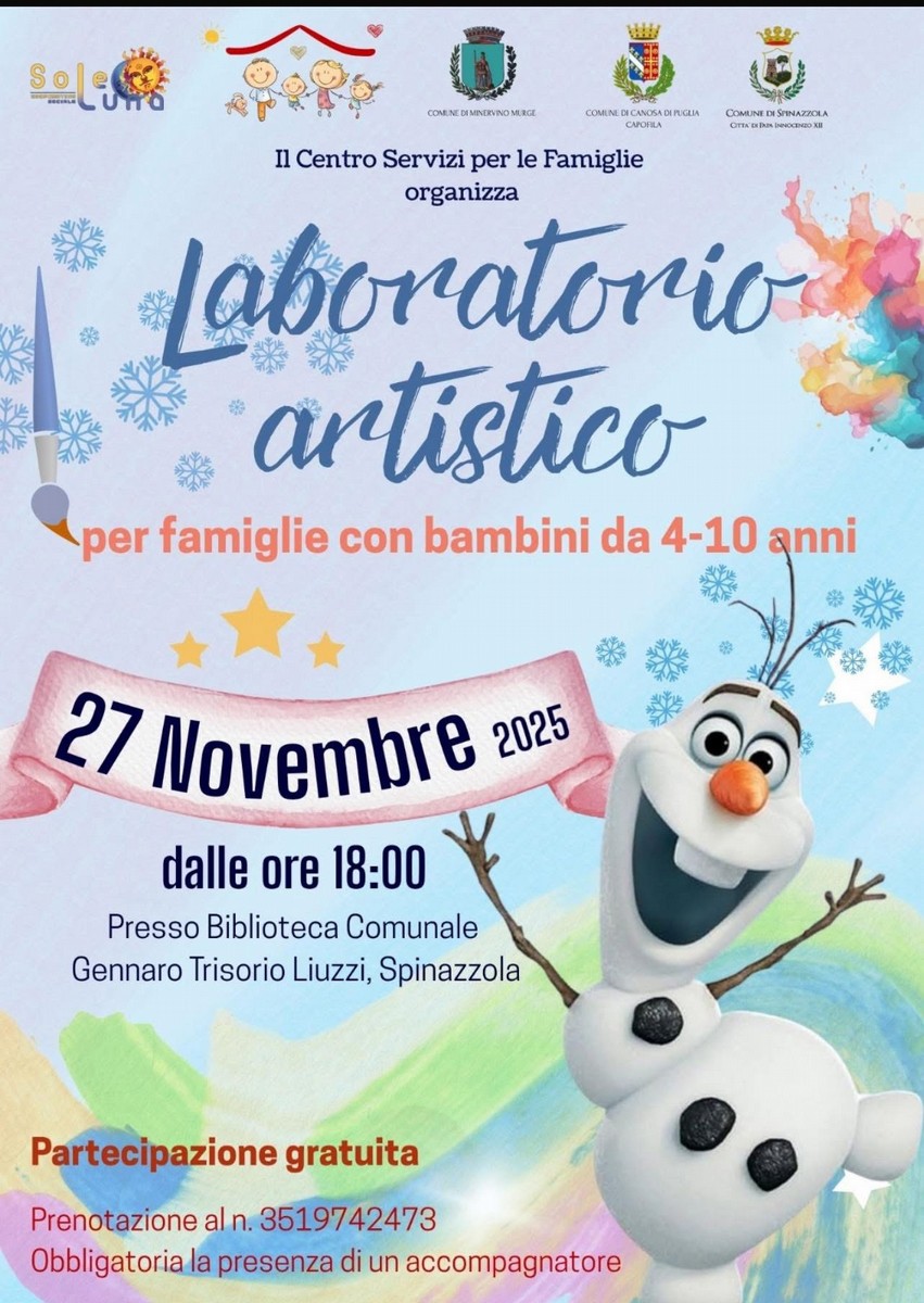 Un'iniziativa dedicata ai bambini dai 4 ai 10 anni per accogliere insieme, con fantasia e creatività, l'arrivo dell'inverno. Queste le premesse del laboratorio artistico che si terrà a Spinazzola il prossimo 27 novembre, alle ore 18, presso la biblioteca comunale "Gennaro Trisorio Liuzzi".