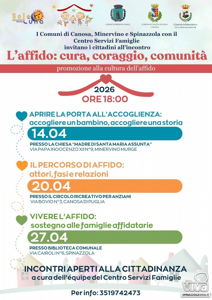 Prendersi cura di un bambino in difficoltà è uno degli atti più concreti di solidarietà che una comunità possa offrire. È con questo spirito che il Centro Servizi Famiglie dell'ambito di Canosa, Minervino e Spinazzola, promuove un ciclo di incontri intitolati "L'affido: cura, coraggio, comunità", dedicati all'affido familiare e rivolti a tutti i cittadini interessati a conoscere da vicino questa importante opportunità.