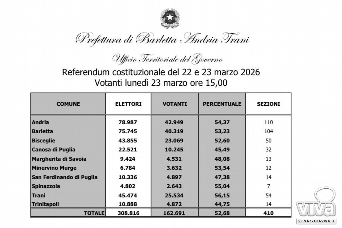 Referendum sulla Giustizia 2026: l'affluenza definitiva a Spinazzola